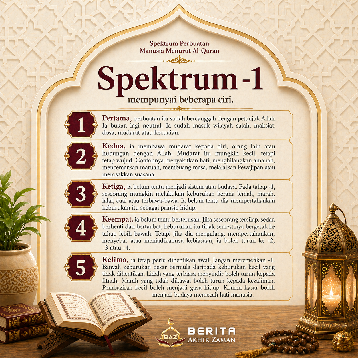 Kelima, ia tetap perlu dihentikan awal. Jangan meremehkan -1. Banyak keburukan besar bermula daripada keburukan kecil yang tidak dihentikan. Lidah yang terbiasa menyindir boleh turun kepada fitnah. Marah yang tidak dikawal boleh turun kepada kezaliman. Pembaziran kecil boleh menjadi gaya hidup. Komen kasar boleh menjadi budaya memecah hati manusia.