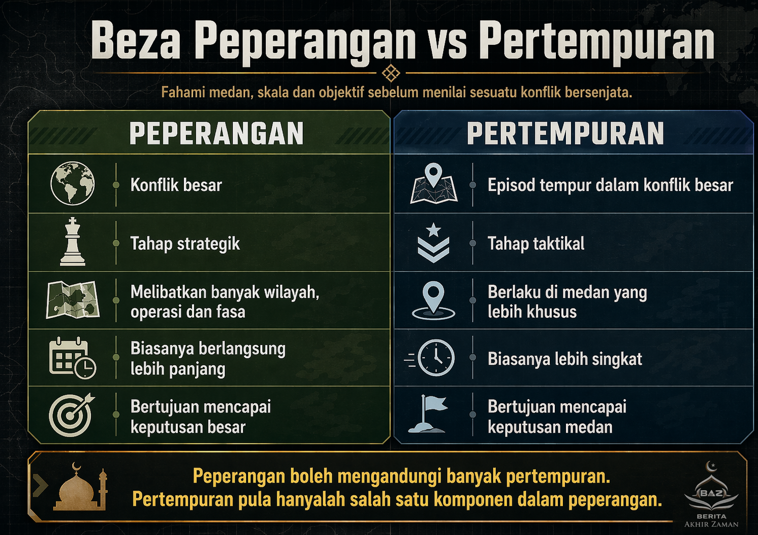 Sebab itu beza peperangan dan pertempuran perlu difahami dari awal. Bukan kerana mahu nampak hebat dengan istilah ketenteraan, tetapi kerana kesilapan kecil pada istilah boleh membuatkan bacaan kita terhadap hadis akhir zaman jadi lari. Satu lokasi yang disebut dalam hadis belum tentu bermaksud seluruh peperangan berlaku di situ. Boleh jadi ia hanya medan pertempuran utama dalam peperangan yang lebih besar.