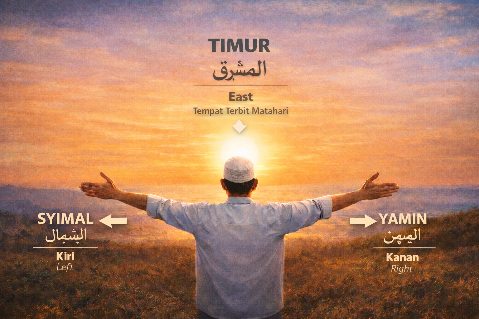 Untuk memudahkan pemahaman, bayangkan anda sekarang berada di Masjidil Haram di Makkah. Hadapkan wajah anda ke arah matahari terbit. Di belakang anda pula ialah arah matahari terbenam. Selepas itu, angkat tangan kanan dan tangan kiri anda ke hadapan pada paras bahu. Bukaan kedua-dua tangan itu pula dibuat sedikit lebih luas daripada bahu anda.