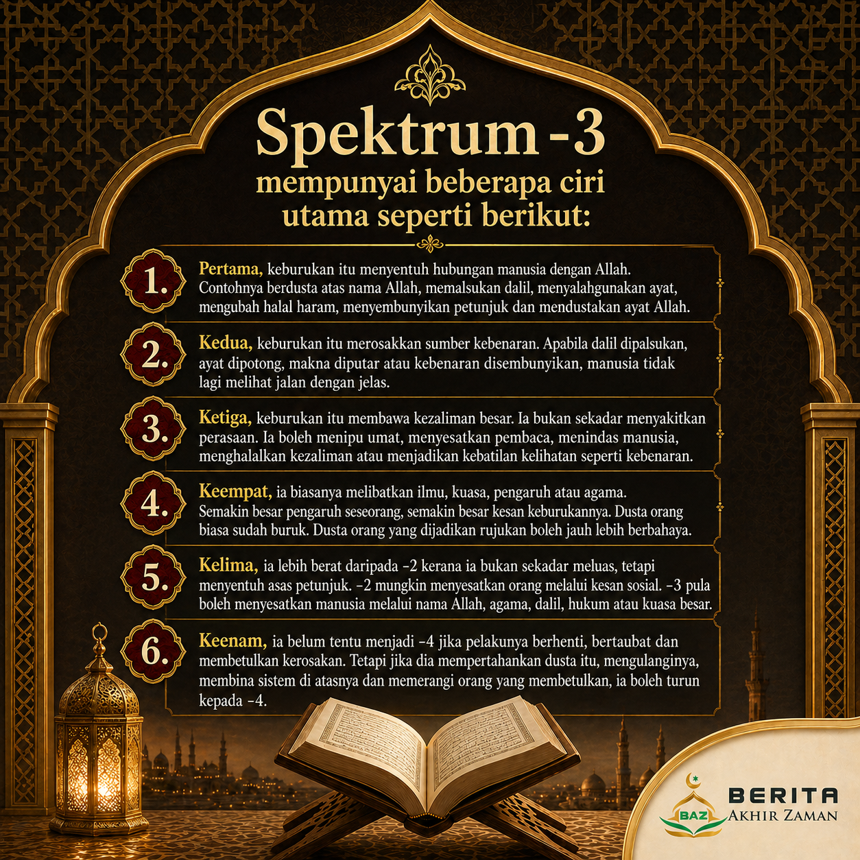 - Kelima, ia lebih berat daripada -2 kerana ia bukan sekadar meluas, tetapi menyentuh asas petunjuk. -2 mungkin menyesatkan orang melalui kesan sosial. -3 pula boleh menyesatkan manusia melalui nama Allah, agama, dalil, hukum atau kuasa besar.