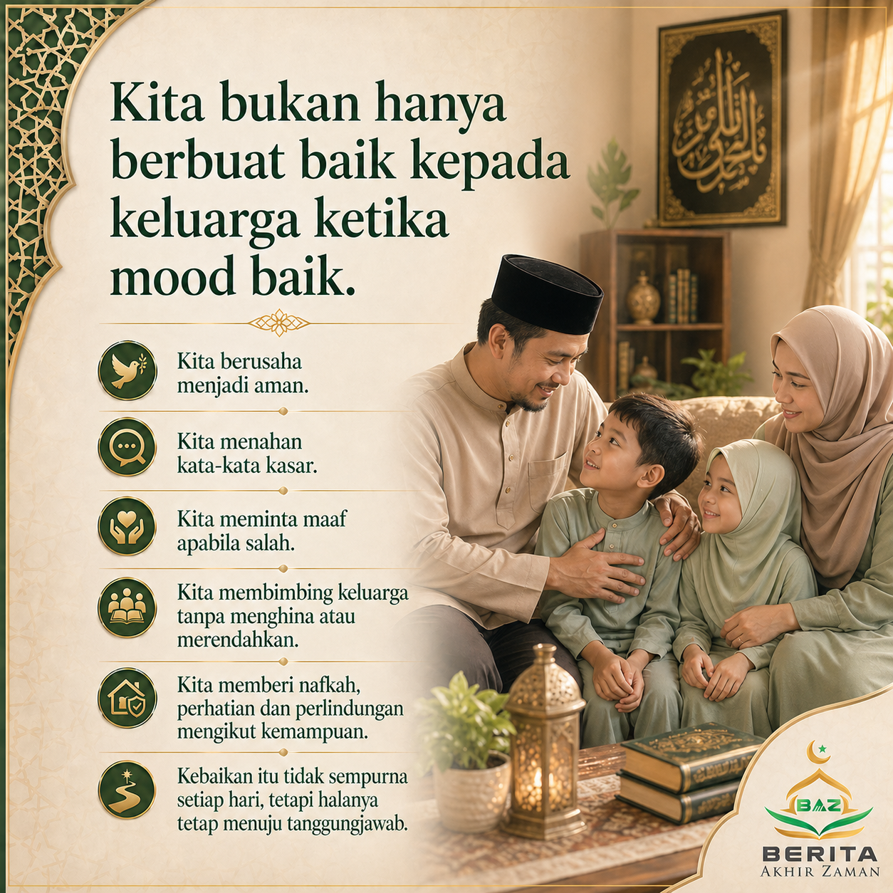 Kita bukan hanya berbuat baik kepada keluarga ketika mood baik. Kita berusaha menjadi aman. Kita menahan kata-kata kasar. Kita meminta maaf apabila salah. Kita membimbing keluarga tanpa menghina atau merendahkan. Kita memberi nafkah, perhatian dan perlindungan mengikut kemampuan. Kebaikan itu tidak sempurna setiap hari, tetapi halanya tetap menuju tanggungjawab.