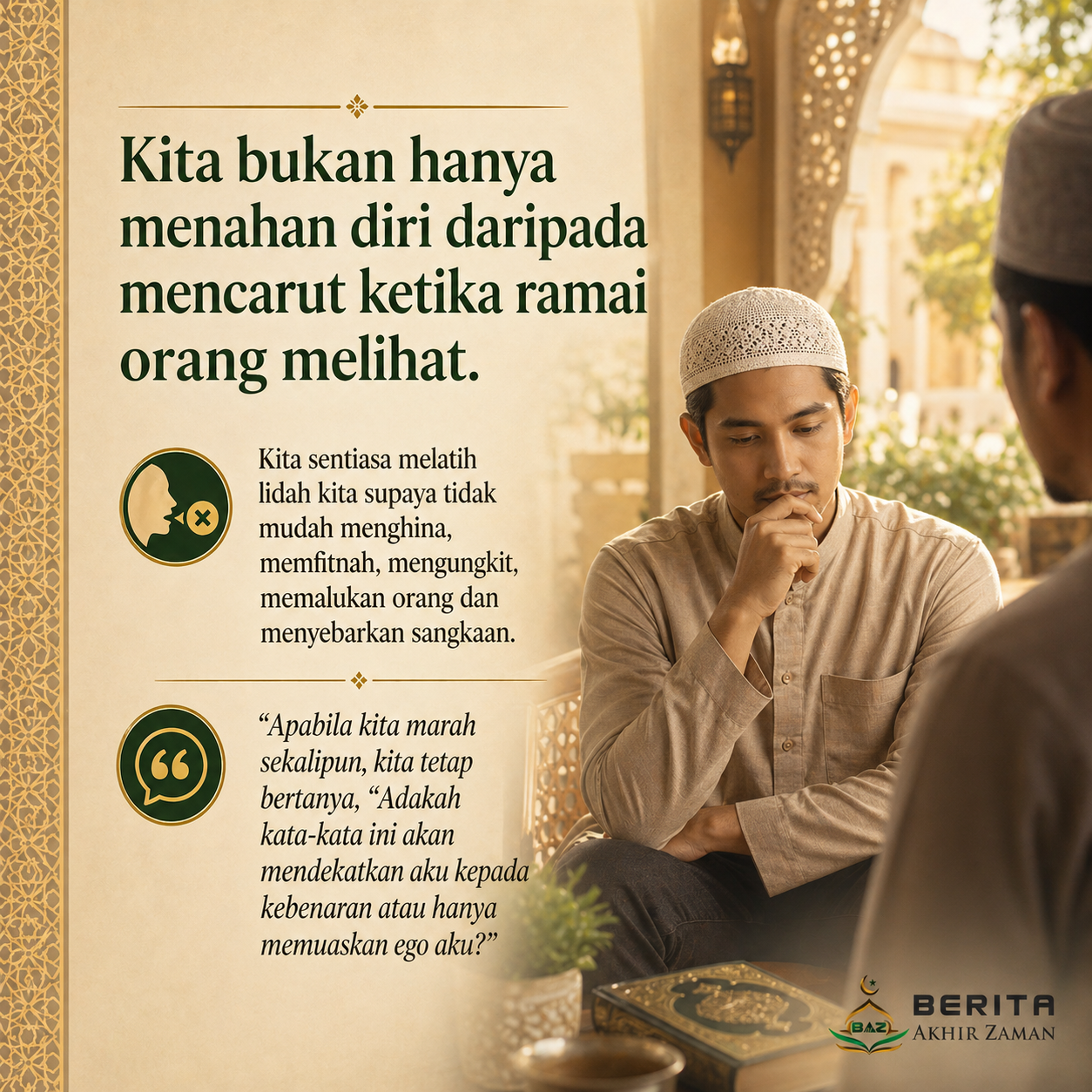Kita bukan hanya menahan diri daripada mencarut ketika ramai orang melihat. Kita sentiasa melatih lidah kita supaya tidak mudah menghina, memfitnah, mengungkit, memalukan orang dan menyebarkan sangkaan. Apabila kita marah sekalipun, kita tetap bertanya, “Adakah kata-kata ini akan mendekatkan aku kepada kebenaran atau hanya memuaskan ego aku?”