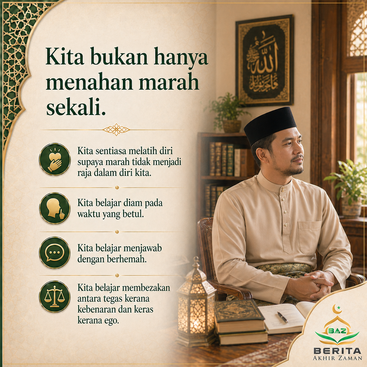 Kita bukan hanya menahan marah sekali. Kita sentiasa melatih diri supaya marah tidak menjadi raja dalam diri kita. Kita belajar diam pada waktu yang betul. Kita belajar menjawab dengan berhemah. Kita belajar membezakan antara tegas kerana kebenaran dan keras kerana ego.