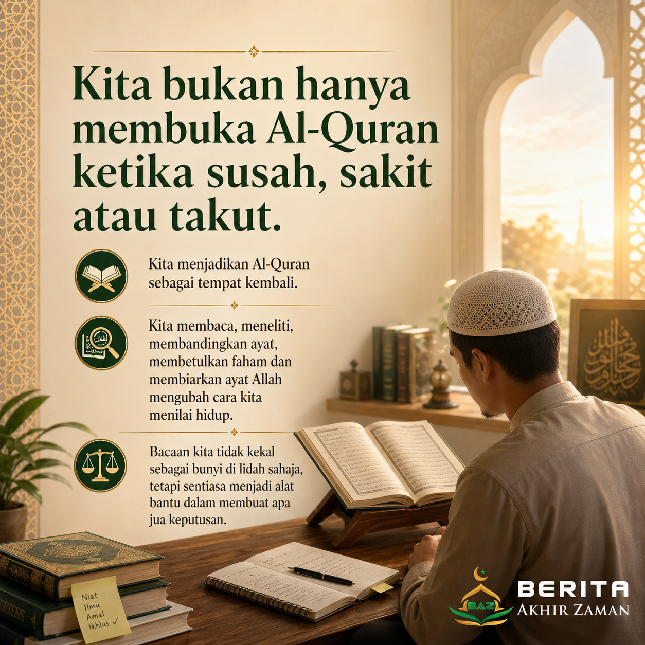 Kita bukan hanya membuka Al-Quran ketika susah, sakit atau takut. Kita menjadikan Al-Quran sebagai tempat kembali. Kita membaca, meneliti, membandingkan ayat, membetulkan faham dan membiarkan ayat Allah mengubah cara kita menilai hidup. Bacaan kita tidak kekal sebagai bunyi di lidah sahaja, tetapi sentiasa menjadi alat bantu dalam membuat apa jua keputusan.