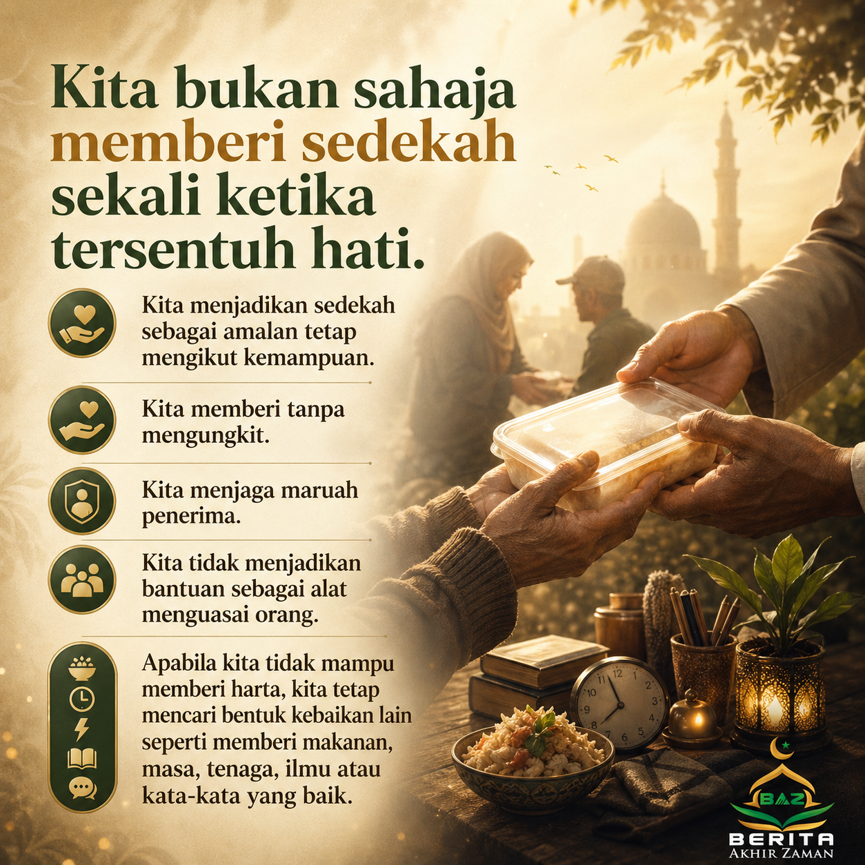 Kita bukan sahaja memberi sedekah sekali ketika tersentuh hati. Kita menjadikan sedekah sebagai amalan tetap mengikut kemampuan. Kita memberi tanpa mengungkit. Kita menjaga maruah penerima. Kita tidak menjadikan bantuan sebagai alat menguasai orang. Apabila kita tidak mampu memberi harta, kita tetap mencari bentuk kebaikan lain seperti memberi makanan, masa, tenaga, ilmu atau kata-kata yang baik.