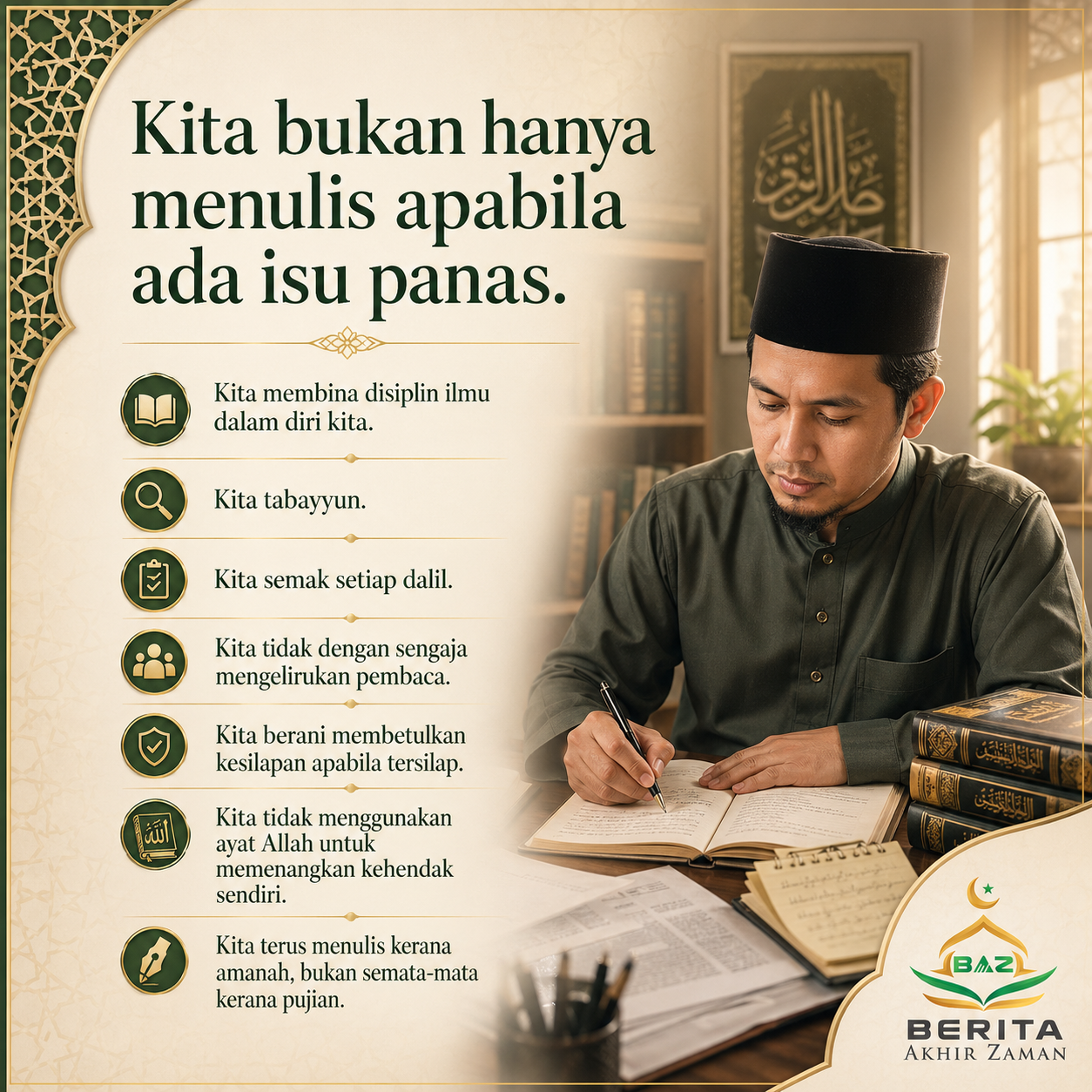 Kita bukan hanya menulis apabila ada isu panas. Kita membina disiplin ilmu dalam diri kita. Kita tabayyun. Kita semak setiap dalil. Kita tidak dengan sengaja mengelirukan pembaca. Kita berani membetulkan kesilapan apabila tersilap. Kita tidak menggunakan ayat Allah untuk memenangkan kehendak sendiri. Kita terus menulis kerana amanah, bukan semata-mata kerana pujian.